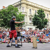 The next act is about the impressive circus discipline called Rola-Bola, it is a risky act which consists of balancing my body under different equilibriums.Into the development of the performance I Show to the audiences different levels of difficulties on the balance. It means, the show becomes more and more impressive minute by minute.